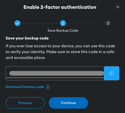 Save your backup code to a secure location. If you ever lose access to your device, you can use this code to verify your identity.
